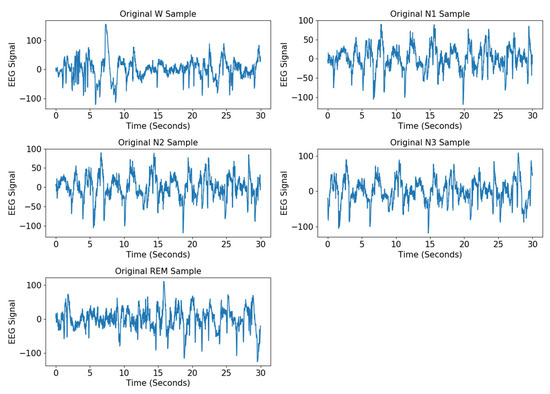 Figure 1 presents EEG signal samples corresponding to the five sleep stages from the original dataset. Each stage is represented by a single 30 s segment, serving as an individual sample that characterizes the typical EEG activity of that stage. The signals from different stages exhibit distinct variations in both frequency and amplitude, demonstrating clear differences. The Wake (W) stage is characterized by low-amplitude mixed-frequency signals. In contrast, the N1 stage begins to exhibit more pronounced theta waves, accompanied by changes in signal amplitude. The N2 stage is marked by sleep spindles and K-complexes, with the signal showing regular oscillatory patterns. The N3 stage, representing slow-wave sleep, is distinguished by high-amplitude delta waves, while the REM stage displays EEG signals resembling those of the wakefulness stage, with low-amplitude mixed-frequency patterns and rapid eye movements.