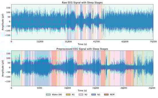 The preprocessing procedure in this study first extracts EEG signals from specified channels in the raw PSG files and verifies that their sampling rate and recording duration are consistent with the sleep stage information in the annotation files. Then, based on the start time and duration of each segment from the annotation file, the sleep stages (W, N1, N2, N3, REM) and labels such as “MOVE” and “UNK” are mapped to numerical values using a predefined mapping dictionary, and the corresponding labels are assigned to signal segments based on 30 s epochs. After synchronizing the signals with the labels, the first and last non-“W” (wake) epoch indices are located, and 60 epochs (i.e., 30 min) are extended forward and backward to retain the transition data before and after sleep onset. Only the signals and labels within this interval are kept, while long wake segments at both ends are discarded. Subsequently, all epochs labeled as “MOVE” and “UNK” are further removed, resulting in high-quality data that only includes the five standard sleep stages. Finally, the processed signal matrix, label vector, sampling rate, original start time, total duration, and the number of original and filtered epochs, along with other metadata, are saved for subsequent analysis and model training. Figure 3 shows a comparison of the sleep stage distribution before and after preprocessing in a segment of the dataset.