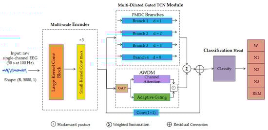 At the final stage of this module, the output features are prepared for the subsequent adaptive dilation-rate gated TCN module. In this manner, the multi-scale encoder demonstrates exceptional capability in extracting features at multiple scales, thereby providing richer representations for the downstream network layers and significantly enhancing the model’s classification performance. The architecture illustrated in Figure 5 clearly delineates this multi-scale convolutional process, enabling the network to effectively capture both low-frequency (deep sleep) and high-frequency (light sleep) signal characteristics, thus facilitating accurate classification of complex sleep stages.