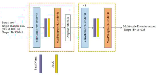 As shown in Figure 5, the multi-scale encoder module consists of a two-stage convolutional encoder designed to capture both long-term low-frequency features through large-kernel convolutions and short-term high-frequency features via small-kernel convolutions. The raw EEG signal is first processed by a large-kernel convolutional layer with a kernel size of 50 and a stride of 6. This configuration increases the receptive field, enabling the extraction of coarse-grained, long-term low-frequency features associated with deep sleep stages. The convolution operation is formulated as follows: