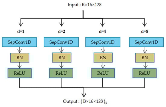 Here, the number of output channels is set to f = 128 to ensure compatibility with the subsequent classifier; the convolutional kernel length is set to k = 3, which strikes a balance between local feature extraction and computational efficiency; and the dilation rate determines the receptive field: