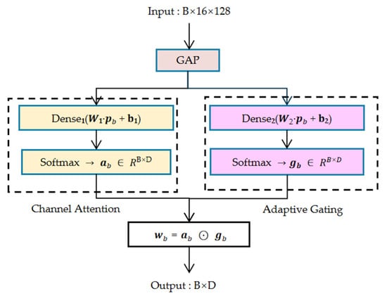The core idea of this module is to first extract multi-scale features using dilated convolutions from the parallel branches, and then adjust the weights of each branch through the adaptive gating mechanism. This enables the network to dynamically prioritize branches based on the input signal’s global characteristics. Additionally, the channel attention mechanism refines the focus on key features, selectively strengthening the contribution of important channels within multi-scale temporal representations. This approach allows the model to effectively adapt to both short-term fluctuations and long-term dependencies, capturing a broad range of temporal information. In the adaptive dilation rate gating mechanism, the input signal is first processed through global average pooling to obtain a global feature vector for each sample. This global feature vector is then passed through a fully connected layer, which calculates the gating weights for each branch. These weights reflect the importance of each branch for the current task. Specifically, the weight coefficients learned by this fully connected layer are dynamically adjusted based on the characteristics of the input signal, thereby automatically assigning appropriate weighted coefficients to each dilation rate branch.