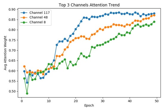 As shown by the experimental results, the complete model—incorporating both the AG and CA modules—achieved the highest performance, with an Acc of 87.1% and a macro-averaged MF1 of 84.0%. When the adaptive gating module (–AG) was removed, the model’s performance degraded significantly, with Acc and MF1 dropping to 85.3% and 79.1%, respectively, highlighting the crucial role of adaptive gating in feature selection and information flow. Further, removing only the channel attention module (–CA) resulted in Acc and MF1 values of 86.0% and 79.8%, respectively—also lower than those of the full model, but higher than those observed when the AG module was removed. As shown in Figure 8, the average attention weights of the top 3 channels exhibit a continuous increase during the training process, gradually stabilizing over time. This indicates that the channel attention mechanism can dynamically focus on key channels, significantly enhancing their feature contributions. These results suggest that the channel attention module effectively models inter-channel feature dependencies, thereby improving the overall performance of the model. Notably, this enhancement is evident in both Acc and macro-average MF1, with a particularly marked improvement in MF1.