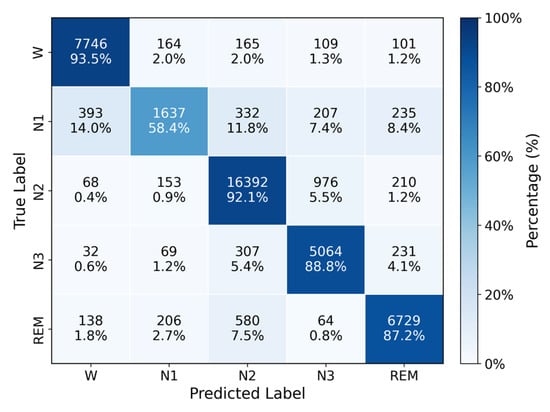 Further analysis of the confusion matrix reveals that misclassifications of N1 predominantly occur as W, N2, and REM, with respective rates of 14.0%, 11.8%, and 8.4%. This pattern underscores the difficulties in discriminating transitional states, particularly between N1 and its neighboring stages, largely due to the ambiguous physiological nature of N1 and the considerable overlap in EEG characteristics. Additionally, there is a notable degree of mutual misclassification between N2 and N3 (5.5% of N2 predicted as N3, and 5.4% of N3 predicted as N2), suggesting that further refinement is needed to better distinguish between light and deep NREM sleep stages. It is also observed that a proportion of REM samples are misclassified as N2 (7.5%), highlighting the partial feature overlap that exists between certain sleep stages within complex sleep architectures.