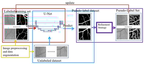 Our proposed semi-supervised vessel segmentation method operates with limited labeled samples in the training dataset. Inspired by semi-supervised learning principles, the framework leverages multiple pseudo-label refinement strategies to iteratively update the training dataset and optimize the segmentation network. Figure 1 illustrates the overall framework architecture, which systematically integrates pseudo-label generation, refinement, and model retraining across successive iterations.