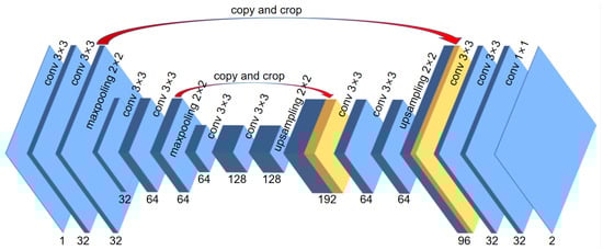 We modified the employed U-Net architecture with a symmetry-aware design philosophy. The detailed structure is shown in Figure 3. The symmetric encoder-decoder framework contains 6 convolutional layers with 3 × 3 convolutional kernels and two 2 × 2 max-pooling layers in the encoder path. The decoder comprises four 3 × 3 convolutional layers and two 2 × 2 upsampling layers, maintaining spatial symmetry coherence through mirrored channel expansion/contraction patterns. After each 3 × 3 convolutional layer, a Rectified Linear Unit (ReLU) and a dropout layer are added to prevent overfitting. During downsampling, the number of feature channels is doubled while the spatial dimensions (height and width) are halved to extract deep features, preserving bilateral symmetry in feature hierarchy. In the upsampling process, the number of channels remains unchanged, and the spatial dimensions are doubled to reconstruct anatomical symmetry patterns. Additionally, a 1 × 1 convolutional layer is appended at the end of the network to map class outputs to corresponding feature channels. The symmetry-guided skip connections concatenate shallow feature maps directly with their corresponding deep feature maps, integrating shallow and deep information through cross-scale symmetry preservation. This is crucial for recovering fine-grained details while maintaining topological symmetry in vascular structures, further improving segmentation accuracy. The symmetric architecture ensures consistent information flow in both encoding and decoding phases, enhancing the model’s ability to capture and reproduce anatomical symmetry patterns inherent in retinal vessel networks.