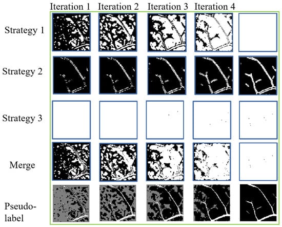 Figure 4 displays the retained (white regions, i.e., ) and discarded (black regions, i.e., ) pixels obtained through the three filtering strategies across five iterations. The fourth row represents the combined retained or discarded pixels from the first three strategies. The final row shows the pseudo-labels obtained by integrating all three filtering processes, where white regions denote retained vessel pseudo-labels, black regions denote retained background pseudo-labels, and gray regions represent eliminated pseudo-labels during iterations.