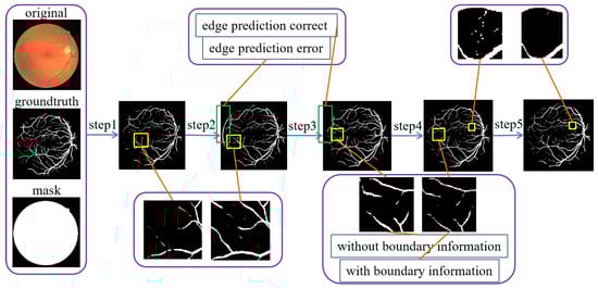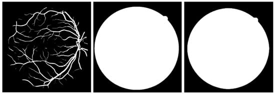 For unlabeled training data, due to the distinct boundary between the circular vessel regions in the original image and the peripheral regions without vessels, pixels at this boundary are often erroneously predicted as vessels. If these mispredictions are repeatedly reinforced during iterative training, errors will accumulate and severely degrade the learning performance and model accuracy. To address this issue, we apply symmetry-aware morphological erosion to the provided masks, shrink the central circular region, and set the central region pixels to 1 and peripheral region pixels to 0 (The erosion method we adopted is Python’s built-in function, with the code being: erosion = cv2.erode (image, kernel, iterations = 1). In this code snippet, image refers to the size of the input images from our dataset, kernel indicates the size of the convolution kernel used during the erosion process, and we set the kernel size to 3 × 3 with the number of iterations being 1. Figure 5 are the comparison images generated after applying the erosion process. The images from left to right are: the predicted result after processing, the mask before processing, and the mask after processing). This symmetry-preserving mask is then multiplied with the original image and its labels, zeroing out pixels in the peripheral and boundary regions of the original image and labels. Subsequently, the aforementioned filtering strategies are applied to exclude these boundary and peripheral regions from training (i.e., ).