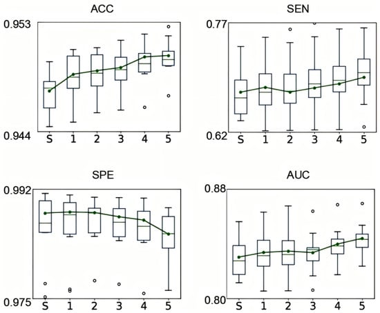 We employ the following four metrics to evaluate model performance: Accuracy (Acc), Sensitivity (Sen), Specificity (Spe), Dice and the Area Under the Curve (AUC) metric.