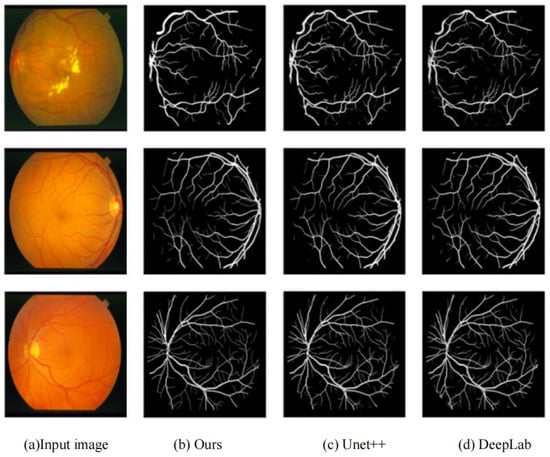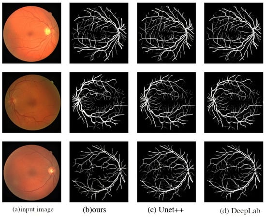 Figure 11 presents partial retinal vessel segmentation results on the STARE dataset. The first column displays the input images. The second column presents the segmentation results of our method, the third column shows results based on U-Net++, and the fourth column illustrates results from the DeepLab method. As shown in Figure 11, our method and the fully supervised U-Net++ method produce comparable segmentation outcomes, both effectively segmenting vessels correctly.