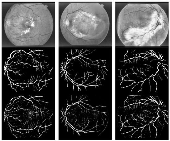 For some of the more severely affected retinal images in the STARE dataset, we have also included segmentation results in Figure 12. In these figures, the first row shows three grayscale retinal input images, the second row presents the corresponding ground truths, and the third row displays the segmentation results achieved by our proposed method. It can be observed that for those severely affected retinal images, where the vessel pixels are distorted due to interference from lesion areas, our method can still segment the vessels. However, the overall segmentation performance on these diseased images is not as good as on healthy images.