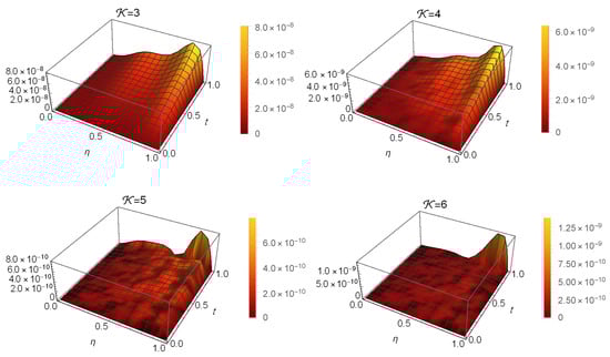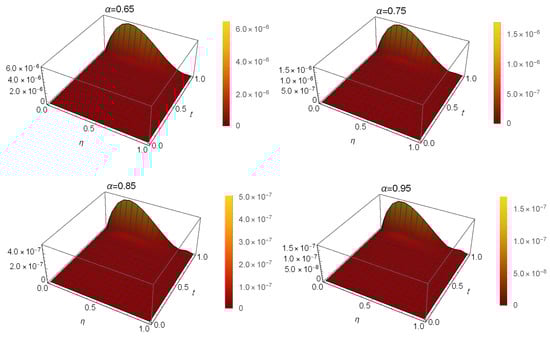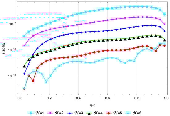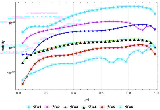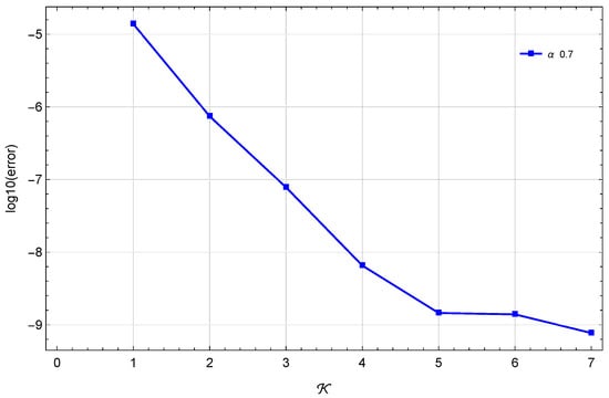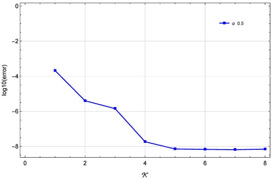 In Table 4 and Table 5, we compare the of our technique at with those in [32,33] at different α and ε values. Table 6 also shows how the proposed technique and the method in [32] compare in terms of the error at different α values. When and , Figure 4 illustrates the at different values of . Figure 5 illustrates the stability at and . Finally, Figure 6 illustrates the Log10(maximum ) at different values of when and . These findings show that this method’s results are quite near to the exact solution.