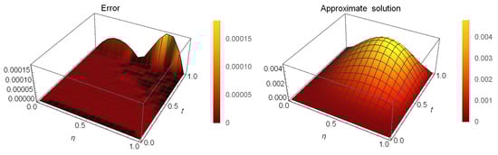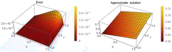 and apply the presented method at and at different values of to obtain Table 10, which illustrates the ARE at various values of . Figure 8 illustrates the ARE and the approximate solution at , and .