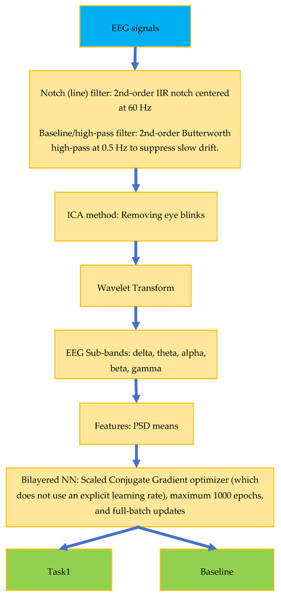 Experimental studies were carried out with signals from electrodes C3 and Fp1. First of all, the features of all EEG sub-bands were obtained by averaging the PSDs using the Welch method. Then, all sub-band power features were used together, and their classification success was compared with the signals from the C3 channel and the Fp1 channel. The highest classification success with the signals from the Fp1 channel was obtained with the bilayered neural network. Signal epochs of 30 s were used in the experiments. Within each epoch, an event-based selection was applied by marking the task-related intervals (e.g., 0–1 s and 0–2 s events), and only these annotated segments were included in the dataset. EEG signals of Task 1 and baseline signals from 109 subjects were analyzed.