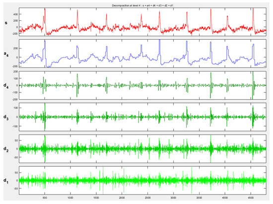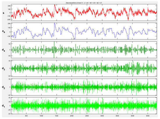 Baseline EEG signal sub-bands obtained by DWT (db4). s represents the baseline EEG signal, a4 denotes the approximation component at level 4, and d4, d3, d2, and d1 correspond to the detail components at levels 4, 3, 2, and 1, respectively.