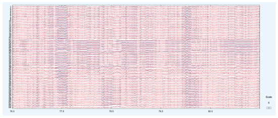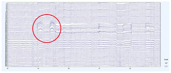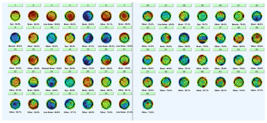 In Figure 6, the regions marked with red circles (22–31, Fp1–F5) indicate large deflections in the EEG signal, which correspond to eye blink artifacts. When the entire recording was examined, clear neural activities were observed in the regions between 1 and 10 on the EEG signals. In addition, 2D component maps were generated, and the regions containing eye blink artifacts were analyzed based on these visualizations.