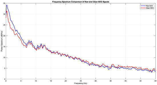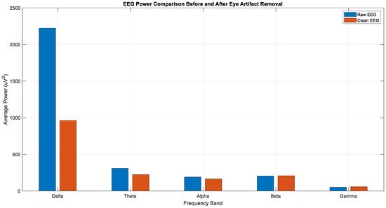 After the ocular artifact removal process, a notable reduction in power within the delta band (0–4 Hz) was observed, confirming that low-frequency signals originating from eye movements were effectively eliminated (Figure 9). The spectral analysis further supports this observation, showing that while the power in the delta band significantly decreased after cleaning, the power profiles of the theta, alpha, and beta bands remained largely preserved (Figure 10). This outcome demonstrates that the artifact removal procedure was both effective and selective, thereby providing a reliable basis for subsequent neural activity analysis.
