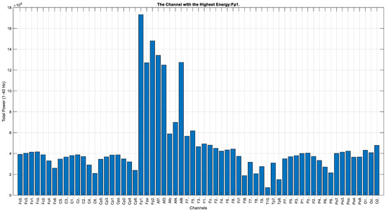 In the graph given in Figure 11, the total energy of the EEG data across 64 channels (within the 1–40 Hz frequency band) is compared. The analysis reveals that the channel with the highest energy is Fp1.
