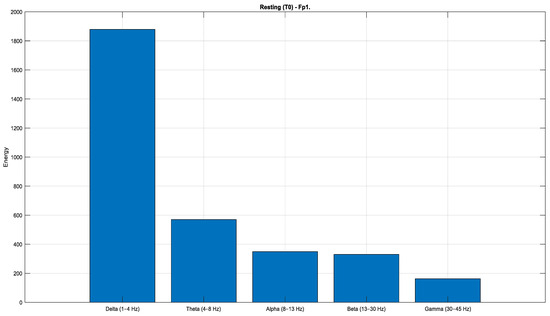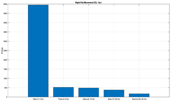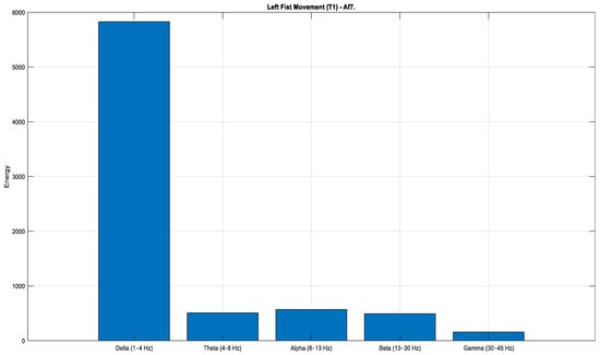For the real movement tasks in the EEG data (Task 1), a channel-based energy and frequency band analysis was conducted with a specific focus on the Fp1 and AF7 channels. According to the analysis of the Task 1, these two channels exhibited the highest energy levels among all channels. To gain deeper insight into their spectral characteristics, the Fp1 and AF7 channels were further decomposed into their respective sub-bands (delta, theta, alpha, beta, and gamma) and reanalyzed. This detailed examination provides a clearer understanding of the neural dynamics associated with motor tasks and highlights the dominant frequency components contributing to the observed energy patterns.