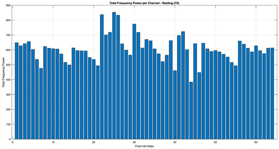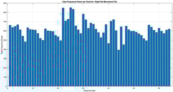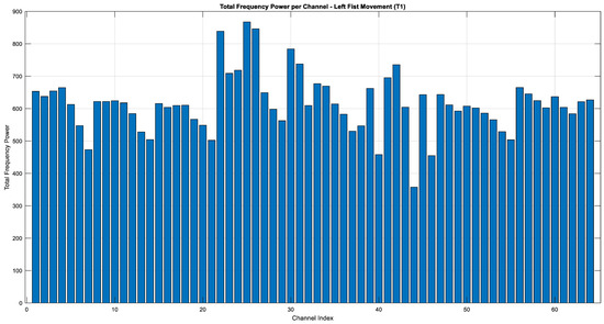The graphs given in Figure 15, Figure 16 and Figure 17 illustrate the distribution of frequency power in the EEG signals during imaginary motor tasks (Task 2, mental simulation of left or right fist opening and closing). The analysis, which calculated the total frequency power within the 1–40 Hz range for each EEG channel, revealed the regions with the highest activity. The results indicate that the Fp1 electrode exhibited the highest energy across all conditions, including resting state (T0) and imagined left-hand (T1) and right-hand (T2) movements. This finding suggests that the left prefrontal region of the brain remains highly active not only during motor imagery but also at rest. The prefrontal cortex, represented by the Fp1 channel, is associated with higher-order cognitive functions such as attention, cognitive planning, and mental imagery. In this context, it can be inferred that neural activity related to motor imagery is particularly concentrated in this area.
