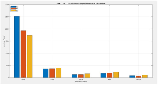 Comparison of sub-band energies of the Fp1 channel in T0, T1, and T2 conditions (Task 2).