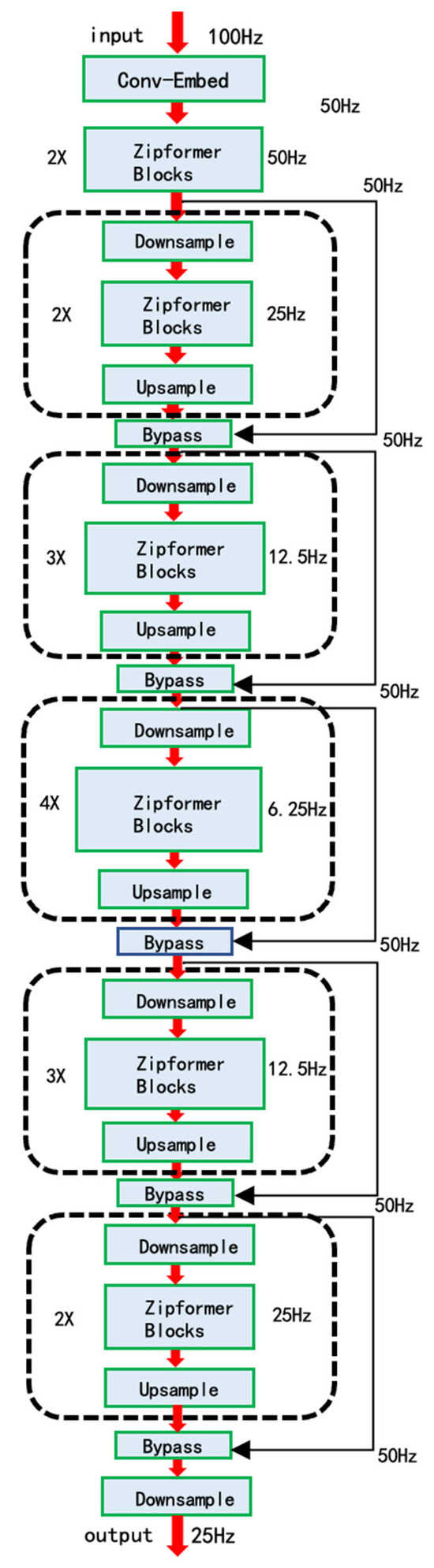 Zipformer is an efficient encoder model tailored for ASR tasks [16]. Building on the classic Conformer architecture, it blends self-attention with convolutional operations and introduces a sparse-attention mechanism, substantially reducing the computational burden of Transformers on long input sequences while preserving the ability to capture global contextual information with high precision.