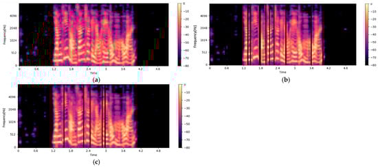 Original spectrograms (a), spectrograms with random masking (b), and those with phoneme-aware masking (c).