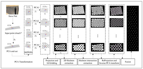 The automated inspection of welded joints is a key technology in the automation of sieve-net welding [17]. In order to realize the automatic detection of sieve-net fabric weld points, this paper proposes the automatic detection of weld joints regardless of sieve-net placement based on 2D skeleton intersection extraction. The framework of the algorithm is shown schematically in Figure 1. First, the point cloud data obtained by scanning the sieve net with a 3D laser scanner is subjected to principal component analysis (PCA), and a new coordinate system is created based on three principal components. Second, the sieve-net point cloud is segmented based on the transformed coordinate system and divided into multiple partitions, and PCA is performed again. Third, the projection is scaled and meshed and a binarized image is obtained. Fourth, image erosion and expansion creates the binarized image of a sieve that forms a connected skeletal region. Fifth, a 2D skeletal algorithm is constructed to capture the 2D skeleton of the sieve net. At the same time, the intersection set of the skeleton is treated as a set of 2D weld points and projected into the 3D space to capture the corresponding 3D weld points. Unlike conventional approaches that assume planar or fixed-position sieve nets, the dual-stage PCA transformation (global and partitioned) employed in this paper dynamically adapts to irregular surfaces, minimizing projection distortion caused by curvature or arbitrary placement. To address the issue of false positives arising from dense grids or noise, redundant skeleton intersections within a mesh-diameter neighborhood are fused, ensuring the precise localization of true weld joints. The main contributions of this work can be summarized as follows: