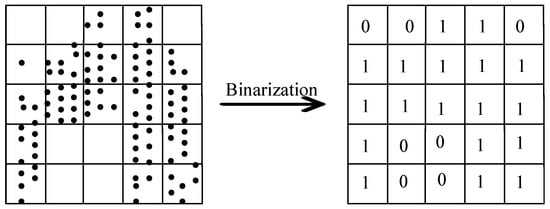 In order to stably extract the welded points of the sieve net, we consider extracting the weld trajectory points based on the characteristics of the 2D image of the sieve net. Firstly, the point cloud is projected to a 2D plane. Then, 2D gridding is achieved on the projected image to generate a 2D binarized image I. The 2D gridded processing is shown in Figure 2, the grid occupied by dots is marked as 1, which is the corresponding pixel value of the image; the others are marked as 0.