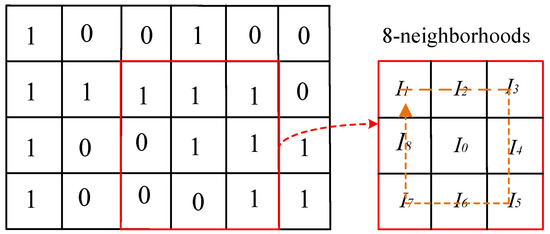 Here, the following basic concepts are first defined. As shown in Figure 3, given an image , each pixel with a value of 1 has 8 neighborhoods. Then, the pixels in the neighborhood are arranged clockwise around . The pixel points with value 1 in the binarized image correspond to target points, and pixel points with a pixel value of 0 correspond to background points.The target points in the 8 neighborhoods where at least one background point exists are treated as boundary points. The number of 1-to-0 conversions around the pixel in the image is denoted as . The number of pixels with a value of 0 in the 8 neighborhoods of is denoted as .