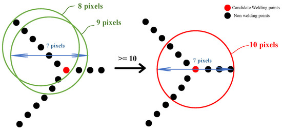 To pinpoint the exact positions of welded joints, skeleton intersections within the image must be extracted subsequent to the skeleton extraction. As illustrated in Figure 4, a circular neighborhood with a diameter of 7 pixels is employed, with the origin of this neighborhood traversing each pixel point sequentially. When the origin of the neighborhood coincides with a skeleton intersection, the neighborhood encompasses at least 10 pixel points. Conversely, if it does not align with a skeleton intersection, the number of pixel points within the neighborhood falls below 10. The neighborhood pixel count, denoted as N(I0), is calculated using brute force methods. Between two reinforcement columns, multiple skeleton intersections may be extracted along the edges. Ideally, the welding point should be centered within the gaps between reinforcements, necessitating the merging of skeleton intersections.