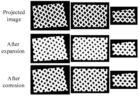 After the projection and binarization of the point cloud data, the images are not completely connected, and there are gaps between the rebar of some sieve nets. To carry out the later skeleton extraction-based sieve-net weld detection, the images need to be processed in some way. Firstly, the expansion process is carried out to increase the diameter of the rebar to achieve the connectivity process, and then, the image is corroded to ensure that the diameter of the rebar remains the same before and after the process. The percentage of connected bars in the images before and after the connected processing is then counted, as shown in Table 3. Figure 6 shows the changes in the images before and after the connectivity treatment for sample1.