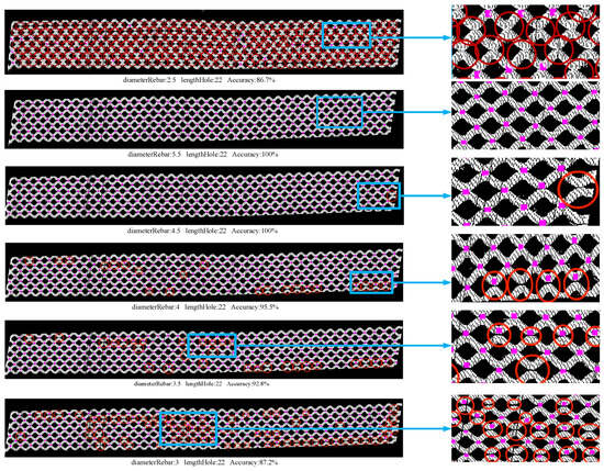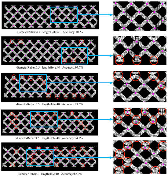 As shown in Table 5, it can also be seen that the detection accuracy and time are more sensitive to changes in the diameter of the reinforcement, and the change law is the same as that observed in sample1. It can be seen that for data with different parameters, the variation in the diameter of the reinforcement between plus or minus 0.5 and the variation in the diameter of the mesh between plus or minus 10 do not have a significant effect on the test results. Figure 7 and Figure 8 show the detection of solder joints when the parameters of sample1 and sample2 are varied, respectively.