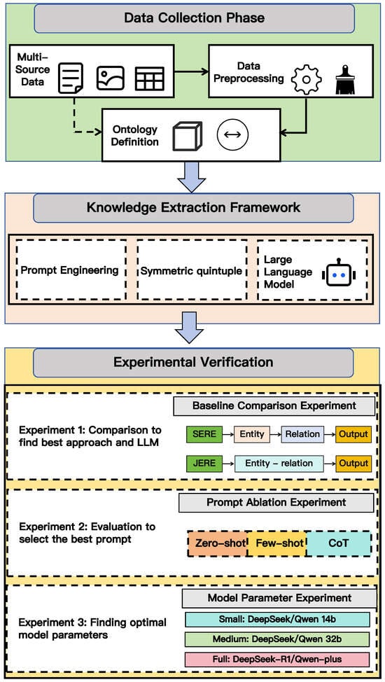 The organizational structure of this paper is as follows: Section 3 introduces in detail the research materials and methods (Materials and Methods). The Materials part contains three core contents: (1) Data Acquisition and Pre-Processing: It elaborates on the acquisition of raw data from the National Mine Safety Administration and the cleaning process. (2) Ontology Definition: This section formally defines an ontology comprising 6 entity types and 13 relation types. (3) Data Annotation: It explains the annotation process based on Doccano and the quality control measures. The Methods part encompasses the following: (1) Models: The large language model architectures selected for the comparative experiments. (2) Symmetric Joint Entity–Relation Extraction: The proposed joint extraction framework. (3) Prompt Strategy: The designed zero-shot/few-shot/CoT prompt engineering schemes. Section 4 validates the effectiveness of the methods through three sets of systematic experiments: (1) Baseline Comparison Experiment: A comparison with the pipeline-based method of first performing entity recognition and then relation extraction. (2) Prompt Ablation Experiment: An analysis of the impacts of different prompt strategies. (3) Model Parameter Experiment: Testing the extraction capabilities of models with different parameter sizes on coal mine equipment safety texts. Finally, the research achievements are summarized and the possible future expansions are discussed. The overall framework of the article is shown in Figure 2.