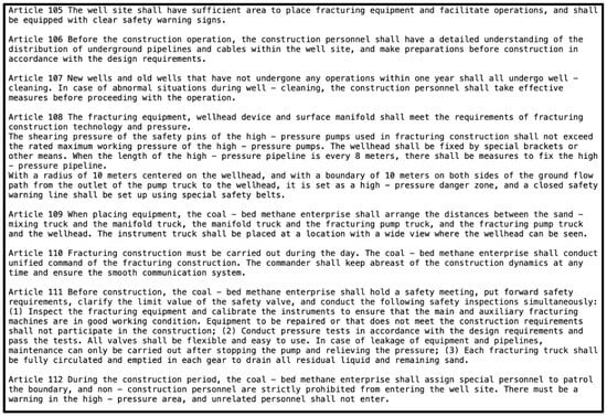 Given the scarcity of publicly available datasets in the field of coal mine equipment safety, this study constructs a dedicated corpus of coal mine safety regulations through systematic data acquisition and pre-processing. The source data is primarily obtained from China’s official website of the State Administration of Mine Safety Supervision, ensuring its authority and reliability. Using Python-based web scraping techniques (Requests + BeautifulSoup), a total of 194 safety-related documents were collected. The source data contains abundant knowledge in the field of coal mine safety production, rendering it of great value for information extraction. As depicted in Figure 3, this text presents information across key dimensions. These include safety norms and standards (such as stipulating that the shearing pressure of the safety pin of a high-pressure pump shall not exceed the rated maximum working pressure), equipment and space management (specifying in detail the relative distances among the sand-mixing truck, manifold truck, and fracturing pump truck), operation procedures and emergency measures (mandating that the distribution of underground pipelines and cables must be grasped prior to construction), as well as communication, coordination, and emergency response (requiring unified command and unobstructed communication). All this information is embedded in unstructured text. To transform this into structured information, we need to systematically clean and structure these texts. First, irrelevant symbols and redundant white-space characters in the text are removed through regular expressions. The expressions of numbers and units are uniformly standardized. In view of the unique structural features of legal provisions, we use “Article x” as the demarcation point for sentence segmentation to ensure the integrity of each semantic unit. Meanwhile, potential format-disorder problems in the original documents are addressed.