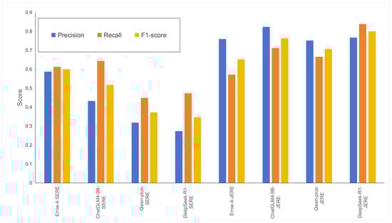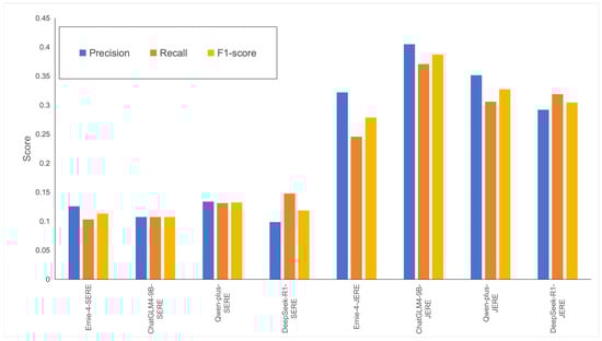 As evidenced in Table 5 and Figure 5, our systematic evaluation demonstrates significant performance disparities between the proposed JERE and conventional SERE paradigms, with JERE consistently outperforming SERE across all models and metrics. The experimental results show that JERE achieves an average F1-score improvement of 157%, with ChatGLM4-9B-JERE attaining the highest F1 score of 0.3872, while precision gains are particularly pronounced, exemplified by ChatGLM4-9B-JERE’s precision of 0.4050 compared to its SERE counterpart’s 0.1074. Among the evaluated models, Qwen-plus exhibits the strongest relative improvement with a 147% increase in F1-score, while DeepSeek-R1 demonstrates the most balanced precision–recall tradeoff in JERE mode, maintaining a difference of less than 0.03 between precision and recall.