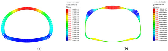 Typical internal stress diagram in tunnel structure: (a) axial force; (b) bending moment.