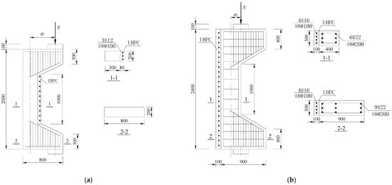 For the NC column, the cross-sectional size is 200 mm × 300 mm, the height is 2000 mm, the concrete is C25, and the eccentricities e0 are 180 mm and 500 mm, respectively. The reinforcement layer adopts UC120 UHPC with a thickness of 30 mm, and three HRB400 steel bars (φ6 mm) are arranged along the column height. For the RC column, the cross-sectional size is 300 mm × 400 mm, the height is 2400 mm, and the concrete used was also C25. Six HRB400 steel bars (φ12 mm) are arranged along the column height and HRB300 steel bars (φ6 mm) are adopted as stirrups. The columns were tested under two loading conditions with eccentricities of 200 mm and 550 mm, respectively. The reinforcement layer employed UC120 UHPC with a thickness of 50 mm, and four HRB400 steel bars (φ10 mm) are configured along the column height. To prevent premature failure of the upper and lower corbels under concentrated forces, the loading surfaces are covered with steel plates, and the corbels are reinforced with high reinforcement. This design philosophy prioritizes column failure over corbel connection failure, effectively demonstrating UHPC’s reinforcement mechanism. The reinforcement diameter and arrangement were optimized to match the UHPC thickness while maintaining practical constructability. The specifications and details of the schemes are illustrated in Figure 2 and Table 1.