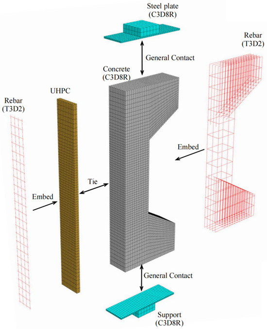 ABAQUS 2022—a finite element analysis platform renowned for its robust capabilities in nonlinear analysis, multi-material modeling, and comprehensive field output visualization—was employed to enable accurate simulation of the structural behavior under investigation. In ABAQUS, the solid element (C3D8R) was used to simulate the concrete and UHPC reinforcement layers, and the truss element (T3D2) was used to simulate the reinforcement. The steel reinforcement was added to the concrete or UHPC strengthening layer by “embed”, and the interface between the concrete and UHPC was set as a “tie” connection. In order to reduce the local stresses near the loading surface during loading, rigid pads with a thickness of 20 mm were set at each end. The finite element model is shown in Figure 3.