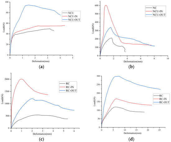 The peak loads in the load-lateral displacement curves are regarded as the ultimate load-carrying capacity. For NC columns, when the eccentricity is 500 mm, the ultimate bearing capacity of the unreinforced column is 51.3 MPa, while that of the externally reinforced column is 94.3 MPa, and that of the internally reinforced column is 56.8 MPa. The bearing capacities of the reinforced columns are increased by 84.0% and 10.7%, respectively. When the eccentricity is 180 mm, the ultimate bearing capacity of the unreinforced column is 211.7 MPa, while that of the externally reinforced column is 338.9 MPa, and that of the internally reinforced column is 602.5 MPa. The bearing capacities of the reinforced columns are increased by 60.1% and 184.6%, respectively. For RC columns, at an eccentricity of 550 mm, the ultimate bearing capacity of the unreinforced column is 120.6 MPa, while the outer-side reinforced column reaches 299.2 MPa and the inner-side reinforced column achieves 166.8 MPa, corresponding to enhancements of 148.1% and 38.3%, respectively. When the eccentricity is 200 mm, the ultimate bearing capacity of the unreinforced column is 541.1 MPa, whereas the outer-side reinforced column attains 1209.3 MPa and the internally reinforced column achieves 2091.4 MPa, representing increases of 123.4% and 286.5%, respectively.