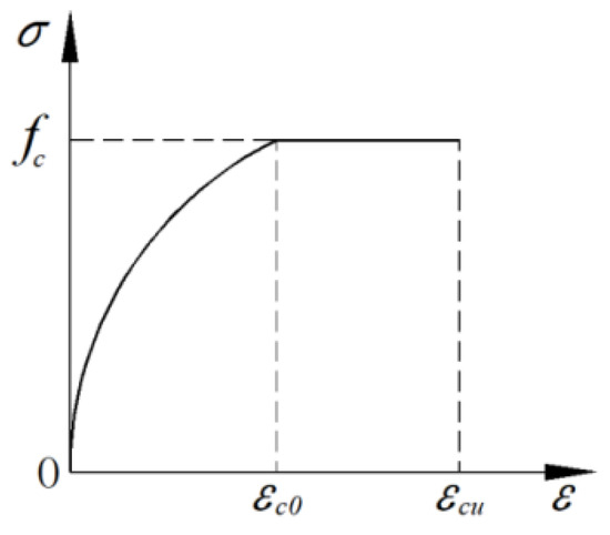 - To facilitate the calculation, the tensile stress of concrete is neglected, and the stress–strain relationship of concrete in the compression zone is simplified, as shown in Figure 5 and Equation (1) [36].where is the compressive strain of concrete. is the compressive stress of concrete corresponding to . Ec is the elastic modulus of concrete. is the uniaxial compressive strength of concrete. is the compressive strain of concrete corresponding to . is the ultimate strain of concrete under compression.