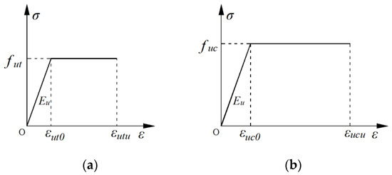 - The mechanical behavior of UHPC before reaching its peak strength is modeled as a linear elastic stress–strain relationship. After UHPC attains its ultimate tensile stress, the embedded steel fibers can still provide residual tensile resistance. For safety considerations, the post-peak descending branches are neglected in this analysis. The stress–strain relationship of UHPC is illustrated in Figure 6 and described by Equations (2) and (3) [38,41].