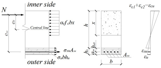 where N is the axial force, and αc is the equivalent coefficient of the rectangular stress diagram of the concrete in the compression zone. b is the section width of the concrete column. h is the height of the concrete column section. x is the height of the concrete compression zone. is the stress of steel bars in the UHPC. is the area of steel bars in the UHPC. is the average stress of UHPC. hu is the thickness of the UHPC reinforcement layer. is the protective layer thickness of steel bars in the UHPC. e0 is the distance from the point of application of axial force N to the section’s center of gravity. esu is the distance from the point of application of axial force N to the center of the steel bars in the UHPC.