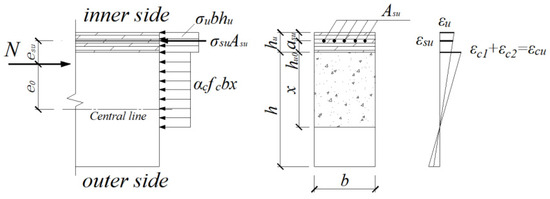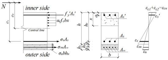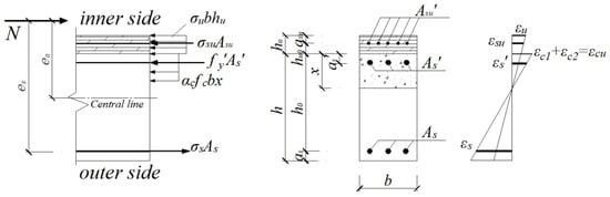 The reinforcement layer is in a tension or compression state depending on the magnitude of the eccentricity. The stress–strain distribution in the cross-section of the reinforced NC eccentrically loaded member under an ultimate state is shown in Figure 7.