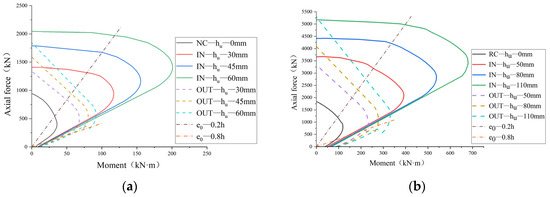 M-N curves of the columns reinforced with UHPC of different thicknesses: (a) NC columns; (b) RC columns.