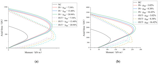 M-N curves of columns reinforced with UHPC of different reinforcement ratio: (a) NC column; (b) RC column.