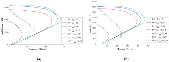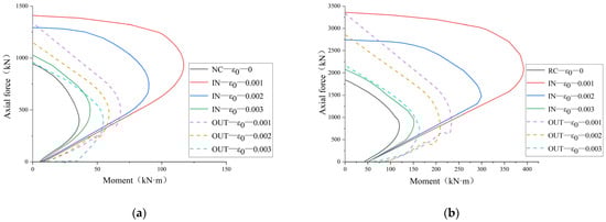 M-N curves of columns reinforced with UHPC under different initial strains: (a) NC column; (b) RC column.