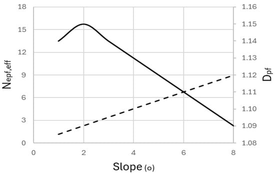The effect of topographic slope on flow complexity. The solid line represents the prefractal dimension (Dpf), and the dashed line indicates the fracturing number (Npf,eff). The simulation assumes the following parameters τy = 103 Pa, h = 10 m, Cc = 0 and g = 9.8 m/s2.