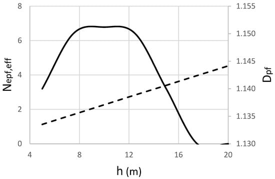 The effect of lava flow thickness on complexity. The solid line shows the prefractal dimension (Dpf) and the dashed line shows the fracturing number (Npf,eff) versus the flow’s bulk thickness (h): τy = 103 Pa, α = 2°, Cc = 0 and g = 9.8 m/s2.