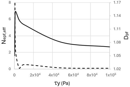 The relationship between yield strength and flow complexity. The solid line shows the prefractal dimension (Dpf) and the dashed line the fracturing number (Npf,eff): h = 10 m, α = 2°, Cc = 0.